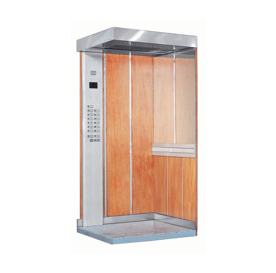 Sendo o veículo de transporte para se deslocar no edifício. Em seu interior ficam a botoeira composta por botões de pressão para seleção do pavimento (andar/piso) onde o usuário deseja ir, o indicador de posição digital (display) informando a posição da cabine, interfone de comunicação, luz de emergência. Em sua parte externa, temos o gongo eletrônico, anunciador vocal, caixa de inspeção, a estrutura onde a cabine é montada (arcada), o freio de emergência, sensores de posição, operador de portas e corrediças é tracionada por meios de cabos de aço que passam sobre a polia acoplada ao redutor da máquina de tração, nos outros extremos desses cabos de aço ficam as pedras do contrapeso.